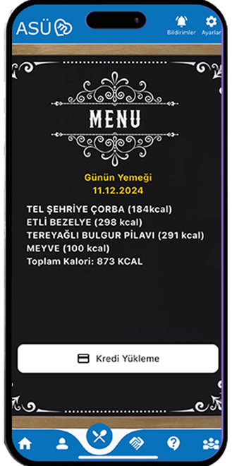 ASÜM’ün yemek modülüyle, yemekhane menüsünü önceden öğrenmek artık çok kolay! Bugün hangi lezzetlerin sizi beklediğini bir bakışta görebilir, öğünlerinizi planlayabilirsiniz. Ayrıca, yemek kartınıza kredi kartıyla hızlı ve güvenli bir şekilde online bakiye yükleyerek sıra beklemeden işlemlerinizi halledebilirsiniz. Tüm yemek ihtiyaçlarınız için pratik ve kullanıcı dostu bir çözüm ASÜM’de!