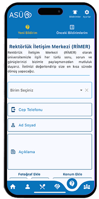 ASÜM’le kampüs hayatınızı daha da iyileştirin. RİMER modülü, üniversite içindeki her türlü iyileştirme taleplerinizi ve önerilerinizi hızlı bir şekilde doğru birime yönlendirerek gerçekleşmesini sağlar. Göndereceğiniz iletiler, yetkili birim tarafından anında görülebilir, gerekli işlemler yapılarak tarafınıza geri bildirim yapılır. ASÜM ile her türlü iletişim ve çözüm süreci daha hızlı ve etkili!